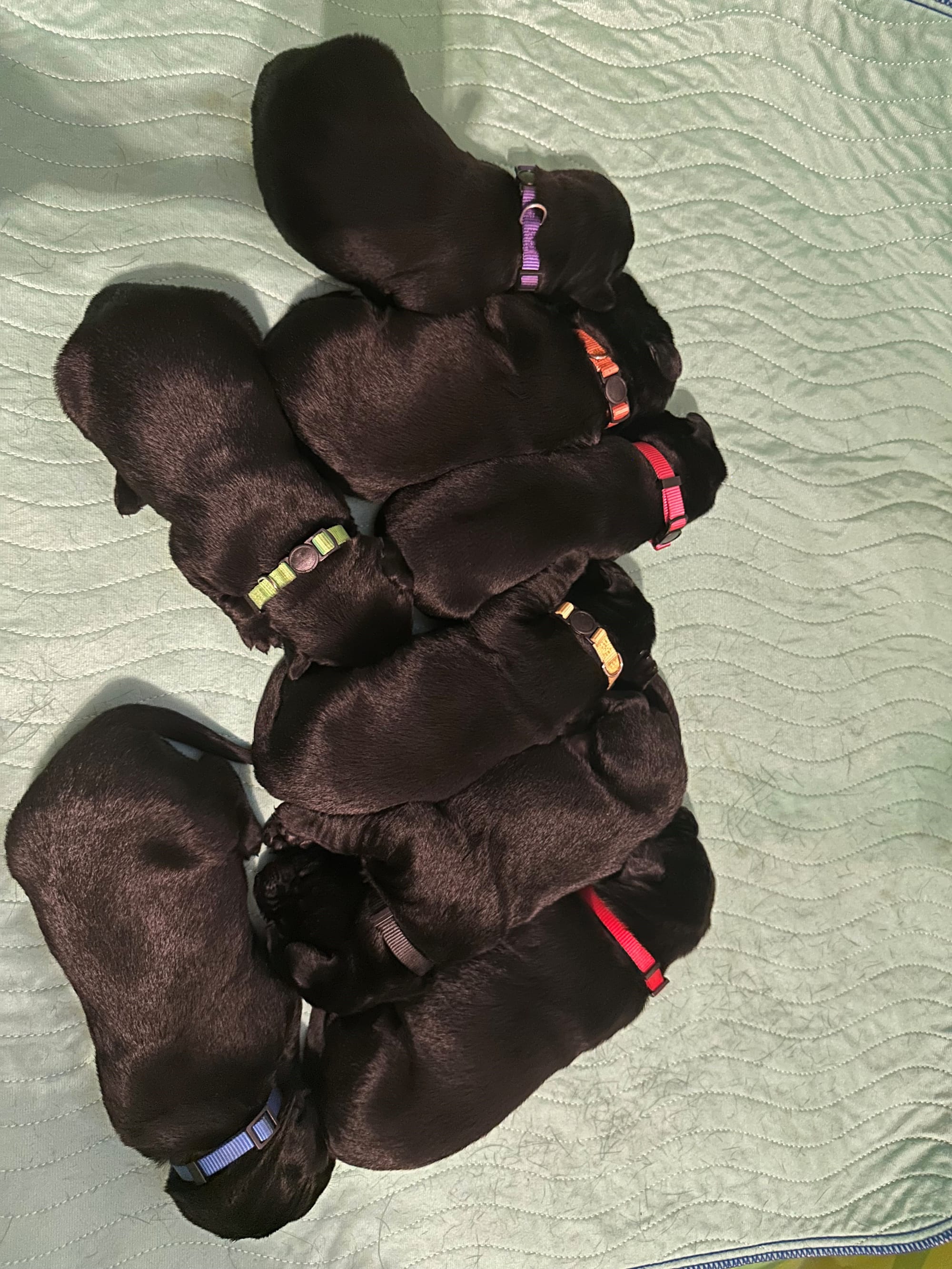 All black litter 6 males, 2 females. Date whelped: 10/19/2025 Pedigree: https://huntinglabpedigree.com/puppy.asp?id=67806